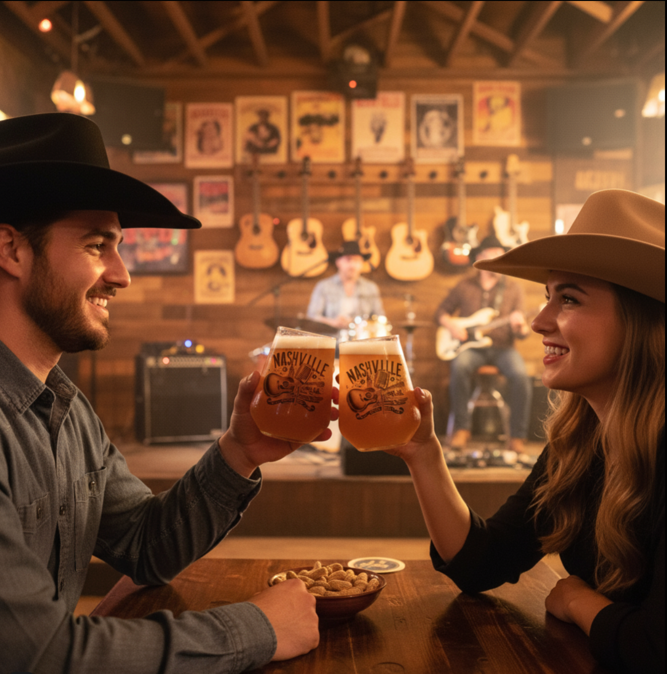 Personalised Western / Country Beer Glass - Retro Guitar & Microphone – 'Nashville Music City' Vintage Line Art